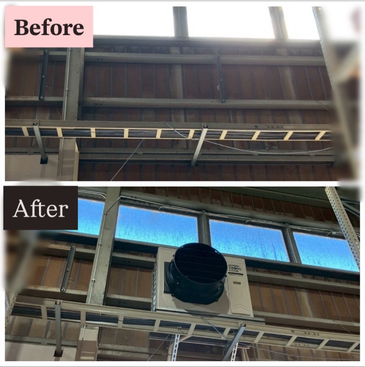 | 2025年8月 茨城県つくばみらい市 【 製品名 】 HYPER STRONG COOL セパレート 1台 【 事業内容 】 カーテンレール 【 相談内容 】 ピッキングエリアの環境改善 【 問題点 】 高所作業車を使用してピッキング作業を行う必要があるため、作業場所が高い位置に設定されている。このため、安全面の配慮や作業効率への影響が懸念される。 【 導入に至る過程 】 複数台の提案があったが、既存の送風機と組み合わせて活用することで、必要な設置台数を減らすことができた。その結果、コストや設置スペースの削減につながり、導入に至った。 【 施工過程・変化 】 施工にあたっては、お客様が所有されている高所作業車をお借りし、作業対象となる高所エリアまで製品を安全に搬送・設置しました。限られたスペースの中での作業となりましたが、事前に作業手順を確認・共有したことでスムーズに施工を進めることができました。高所での作業であったため、安全面に十分配慮しながら慎重に対応を行いました。 【 お客様の声 】 これまで作業スペースが天井付近まであり、特に夏場は熱がこもって非常に暑く、作業環境としては厳しい状況が続いていました。しかし、今回導入いただいたハイパーストロングクールは、非常に力強い風量で空気をしっかり循環させてくれるため、設置後は明らかに体感温度が下がり、快適に作業できるようになりました。 【 担当者 】 今回のように、すでにお客様がお持ちの機器や設備を有効活用することで、新たな機器の導入台数を抑え、全体のコスト削減につなげるご提案も可能です。現場の状況やご要望に応じて、最適なプランを一緒に検討させていただきますので、「新しく買い替えなければならない」とお悩みの際も、まずはお気軽にご相談ください。お客様にとって最善のご提案ができるよう、柔軟に対応させていただきます。 |