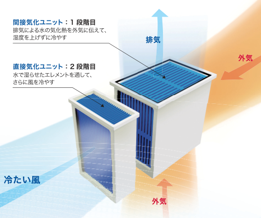 間接気化冷却と直接気化冷却を組み合わせたTwinAquaは、気化冷却でありながら、パワフルで快適な風を生み出します。本技術は冷媒を使わず環境にも配慮した冷却技術で、