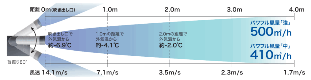 PureDriveは約-4℃の風を、実使用地点(吹き出し口から1m)に届けることができます。