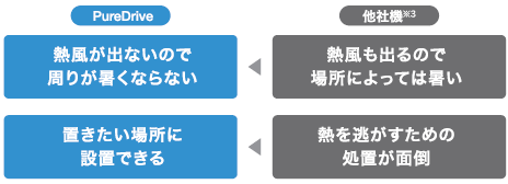 熱風を排気するヒートポンプ式スポットクーラーと異なり、気化冷却式の「PureDrive」は冷たい風だけをお届けします。