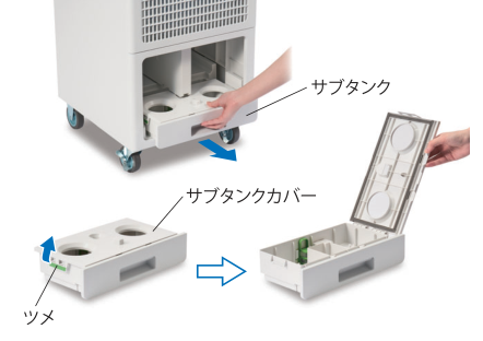 サブタンクの取り外しができるようになり、従来機種より水抜きや清掃がしやすくなりました。2週間に1回の清掃をおすすめします。