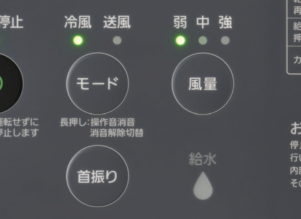 簡単に操作できる操作パネルです。モードと風量は3段階の調整や首振りの切り替えが可能です。(首振りボタンは首振りモデルのみ)