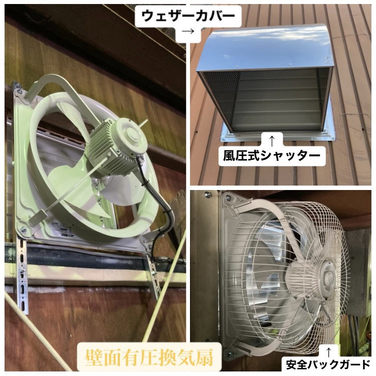 壁面換気扇の導入にあたり、換気効率と安全性を確保するため、風圧式シャッター、ウェザーカバー、安全バックガードの必要性についてご説明し、ご理解いただいたうえで設置を行った。これにより、外部環境の影響を受けにくく、安全性にも配慮した換気設備となった。