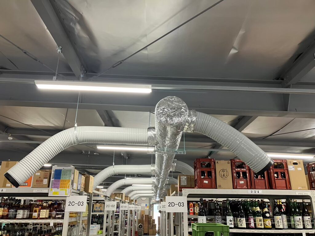 | 2023年8月 京都府京都市 【 製品名 】 ハイパーストロングクール 1台 ダクト吹出(14箇所) 遮熱シート 415㎡ 【 事業内容 】 酒屋・倉庫業 【 相談内容 】 2F作業場の従業員熱中症対策 夏の暑い時期は特に熱気が溜まり作業員の作業効率も落ちる 【 問題点 】 棚に出荷前のお酒を並べており、施工時に破損しないように気を付けて作業しなければならない。既存サーキュレーターは中央通路に設置されており、等間隔に並んだ棚の各通路には風を送れない。 【 導入について 】 7月上旬にデモンストレーションを実施し効果を実感いただきました。今夏中に間に合わうよう施工を希望されており、8月のお盆前に施工完了できるよう手配しました。 各通路に冷風を送るためにはダクトが14本必要でした。棚間隔に合わせて寸法を考慮しダクト配列を設計しました。 【 施工について 】 施工初日にハイパーストロングクールの施工を完了しました。ハイパーストロングクールの吹出しをダクト施工することで棚間ごとに冷風が行き渡り、ハイパーストロングクールのみでも涼しくなったと仰っていただけましたが、遮熱シートで天井からの輻射熱を断熱しすることでさらに効果を高めました。 【 お客様の声 】 作業途中から涼しさを実感していたが、施工が完了し2つ組み合わせて施工したことでより涼しく感じる。 【 担当者より 】 当初は予算の関係でどちから1つの施工を考えていたところ1度にに大きく効果を出したいとの事で急遽組み合わせで施工することになりました。繁忙期という事もあり施工日の調整等ご協力いただき無事お盆前施工完了できました。 |