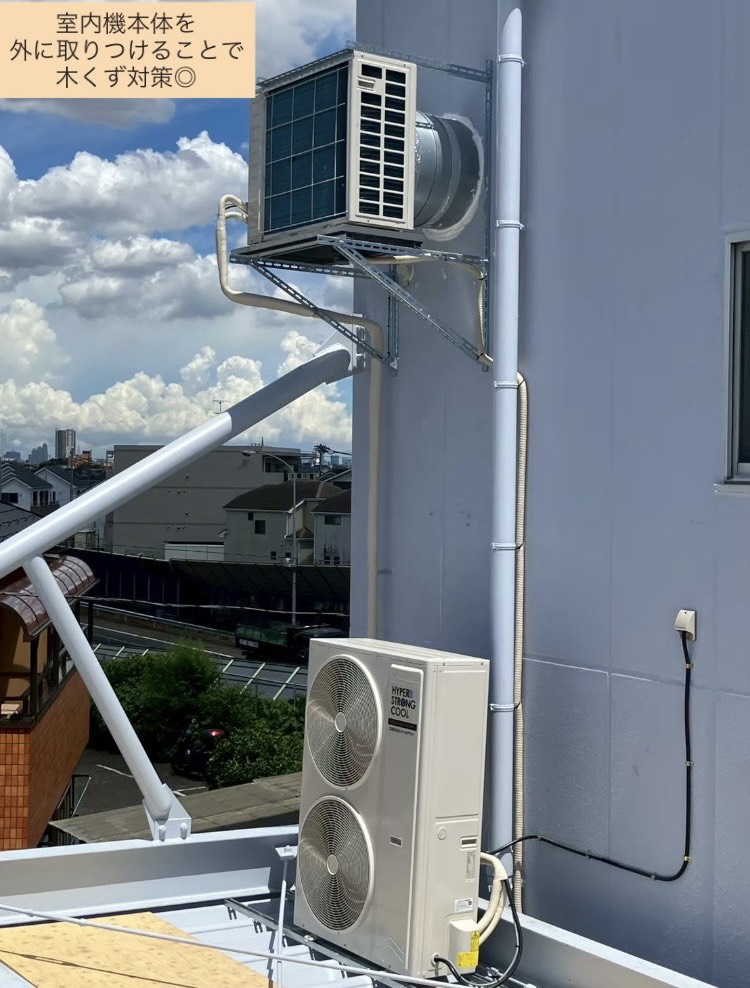 | 2025年7月 東京都調布市 【 製品名 】 HYPER STRONG COOL セパレート 2台 【 事業内容 】 木工所 【 問題点 】 現場周辺では木片や木くずが舞っており、作業環境があまり良好ではない。 また、室内機の設置可能な場所が限られており、レイアウト上の制約が大きいことから、機器選定および配管ルートの検討に注意を要する。 【 導入に至る過程 】 木材加工現場は、木屑や粉塵、湿度などの影響により、通常のエアコンを使用すると故障が発生しやすい環境である。そのため、現場の環境に適した空調設備の導入が必要 そこで、室内機を室内ではなく外部に設置し、ダクトを用いて室内に冷暖気を送る方式を提案 【 施工過程・変化 】 施工にあたっては、室外機の設置場所として建物の庇上を確保し、安定した設置を行った。機器の設置場所を工夫することで、現場特有の粉塵や湿度の影響を最小限に抑えることができた。 【 お客様の声 】 設置後、室温が大幅に下がり、作業環境が非常に快適になったと感じています。 【 担当者 】 木工所など粉塵が多く舞う環境では、通常の空調設備では故障や性能低下が懸念されます。しかし、複数の提案を組み合わせることで、室外機の設置位置やダクトの取り回し、機器選定の工夫など、現場特有の課題も解決することができます。現場ごとの環境に応じた最適な提案を行うことで、安全で快適な作業環境を提供できると考えています。 |