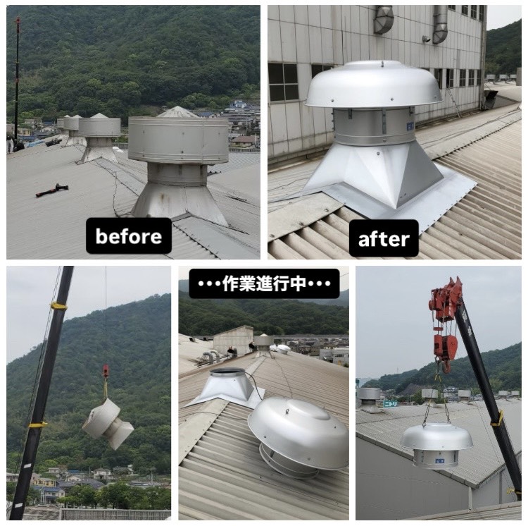 | 2020年6月 広島県海田町 【 製品名 】 ルーフファン SVO-750TA (防鳥網仕様) 3台 【 事業内容 】 既設自然換気ベンチレーターの更新依頼 【 相談内容 】 ・工場内の換気が十分に行われておらず、生産環境の改善を図りたいとのことで、自然換気から強制換気扇への更新をご希望されました。 ・既設の自然換気扇は常時開放状態であったため、外部から鳥が侵入して巣を作ってしまうという問題を抱えておられました。 【 導入に至る過程 】 開口部を保護できる防鳥網仕様のルーフファンをご提案したところ、機能面と安全性の両立が図れる点をご評価いただき、導入の運びとなりました。 【 お客様の声 】 換気不足だけでなく、鳥の侵入にも悩まされていましたが、防鳥網付きのルーフファンをご提案いただき、安心して使用できるようになりました。換気の重要性も丁寧に説明していただき、スムーズな施工でとても助かりました。 【 担当者 】 既設の自然換気扇では鳥の侵入による被害が生じていたことから、防鳥対策として防鳥網仕様のルーフファンをご提案し、対策を含めてしっかり施工させていただきました。お客様のお困りごとを解決しつつ、換気環境の改善に貢献できたことを大変嬉しく思っております。 |
