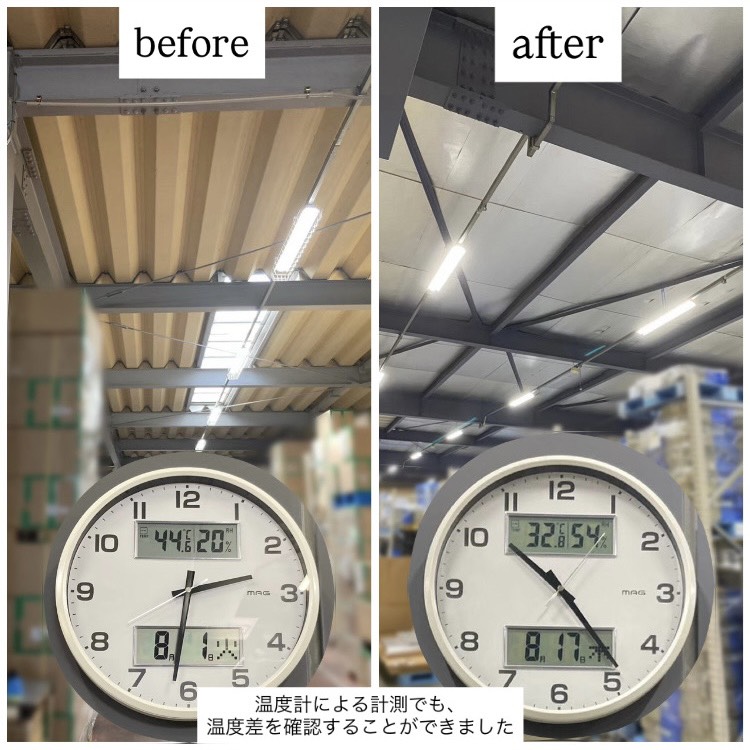 | 2023年8月 愛知県豊田市 【 製品名 】 IS遮熱シート GC-R (建屋内・屋根下施工) 3200m² 【 事業内容 】 輸送業務サービス・保管業務サービス・輸出入業務サービス 【 問題点 】 現地確認を行ったところ、2階エリアの環境温度は最大で44℃に達しており、作業員の体調管理や安全面の観点からも、早急な改善対応が必要な危険な状態であった。 【 導入に至る過程 】 当初は、隣接する建屋に施工されていた遮熱塗料との比較検討をされていたが、遮熱効果の持続性や将来的なメンテナンスコストを踏まえ、半永久的に使用可能な遮熱シート施工をご提案した。 長期的な視点でのコストパフォーマンスをご評価いただき、導入に至った。 【 施工過程・変化 】 真夏の施工であったため、屋根下付近の温度は50℃近くまで上昇し、日中作業では施工担当者が熱中症となる危険性があった。そのため、安全を最優先とし、夜間作業に切り替えて施工を実施した。 【 お客様の声 】 以前と比べると、環境がまったく違うと感じています。暑さが大きく軽減され、非常に満足しています。 【 担当者 】 今回のように、倉庫の2階エリアの暑さに悩まれているお客様は多くいらっしゃいます。 本事例を通じて得られた効果や経験を活かし、同様のお悩みをお持ちのお客様へも、自信をもってご提案していきたいと考えております。 |