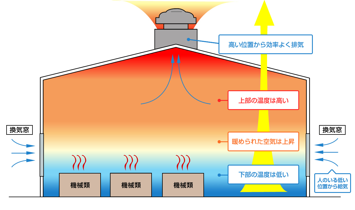 工場や倉庫などの広い空間で天井付近に溜まりやすい熱気を効率的に排出することで室温上昇を抑え、快適な作業環境を実現するために重要です。